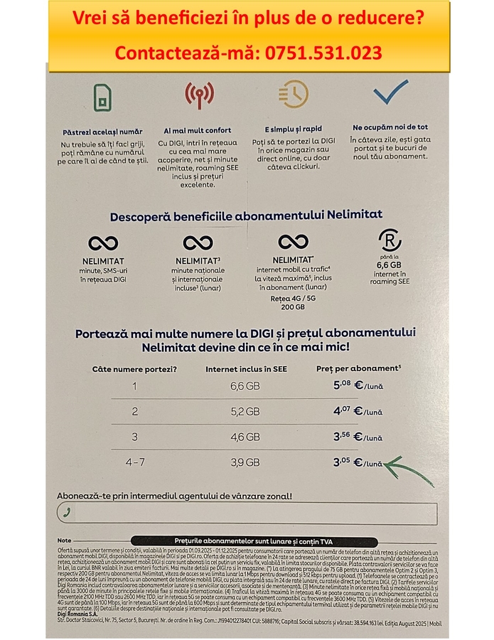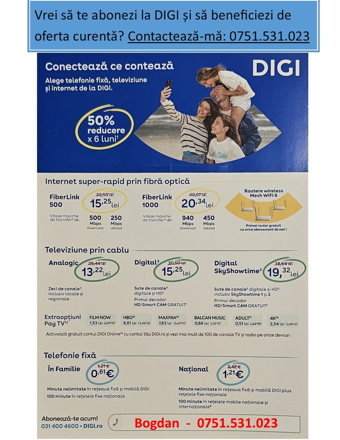 Ma poti contacta pentru a beneficia in plus de o reducere de 50% timp de 4/6/12 luni in functie de zona in care te afli.