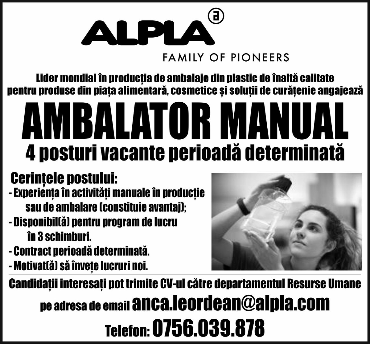 angajeaza ambalator manual: 4 posturi vacante perioada determinata. Cerintele postului: experienta in activitati manuale in productie sau de ambalare (constituie avantaj); disponibl(a) pentru program de lucru in 3 schimburi. Contract perioada determinata, motivat(a) sa invete lucruri noi.