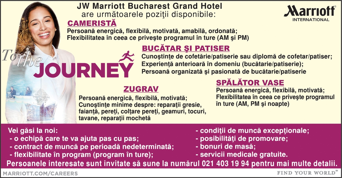 / patiserie sau diploma de cofetar/ patiser, experienta anterioara in domeniu (bucatarie/ patiserie), persoana organizata si pasionata de bucatarie/ patiserie, pt. JW Marriott Bucharest Grand. Vei gasi la noi: o echipa care te va ajuta pas cu pas, contract de munca pe perioada nedeterminata, flexibilatate in program (program in ture), conditii de munca exceptionale, posibilitati de promovare, bonuri de masa, servicii medicale gratuite. Persoanele interesate sunt invitate sa sune la numarul tel.: