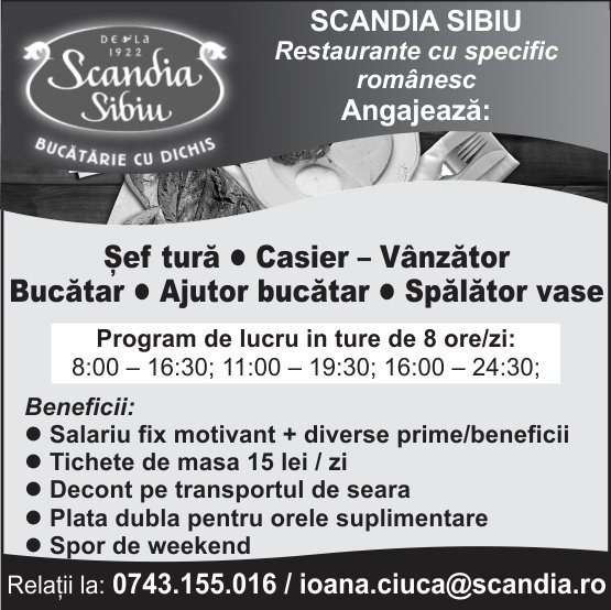 sef de tura, bucatar, ajutor de bucatar, spalator vase pt. Scandia Sibiu, Restaurante cu specific romanesc. Program de lucru in ture de 8 ore/zi: 8:00 - 16:30; 11:00 - 19:30; 16:00 - 24:30. Beneficii: salariu fix motivant + diverse prime/beneficii, tichete de masa 15 lei/ zi, decont pe transportul de seara, plata dubla pentru orele suplimentare, spor de weekend. Relatii la tel.