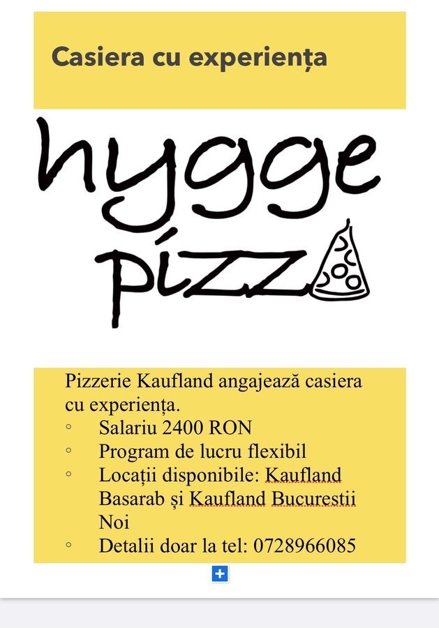 Pizzeria Kaufland anagajeaza casiera cu experienta.Salariu 3000 lei , program lucru flexibil. Locatii disponibile: Kaufland Basarab si Kaufland Bucurestii Noi.