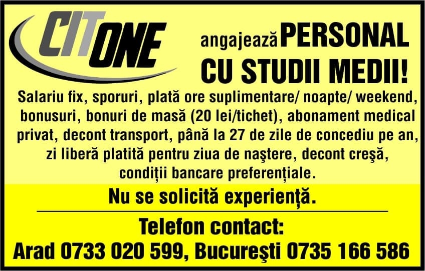 CIT ONE angajeaza personal cu studii medii! Salariu fix, sporuri, plata ore suplimentare/ noapte/ weekend. bonusuri, bonuri de masa (20 lei/tichet), abonament medical privat, decont transport, pana la 27 de zile de concediu pe an, zi libera platita pentru ziua de nastere,decont cresa, conditii bancare preferentiale. Nu se solicita experienta. Arad-0733020599, Bucuresti- 0735166586
