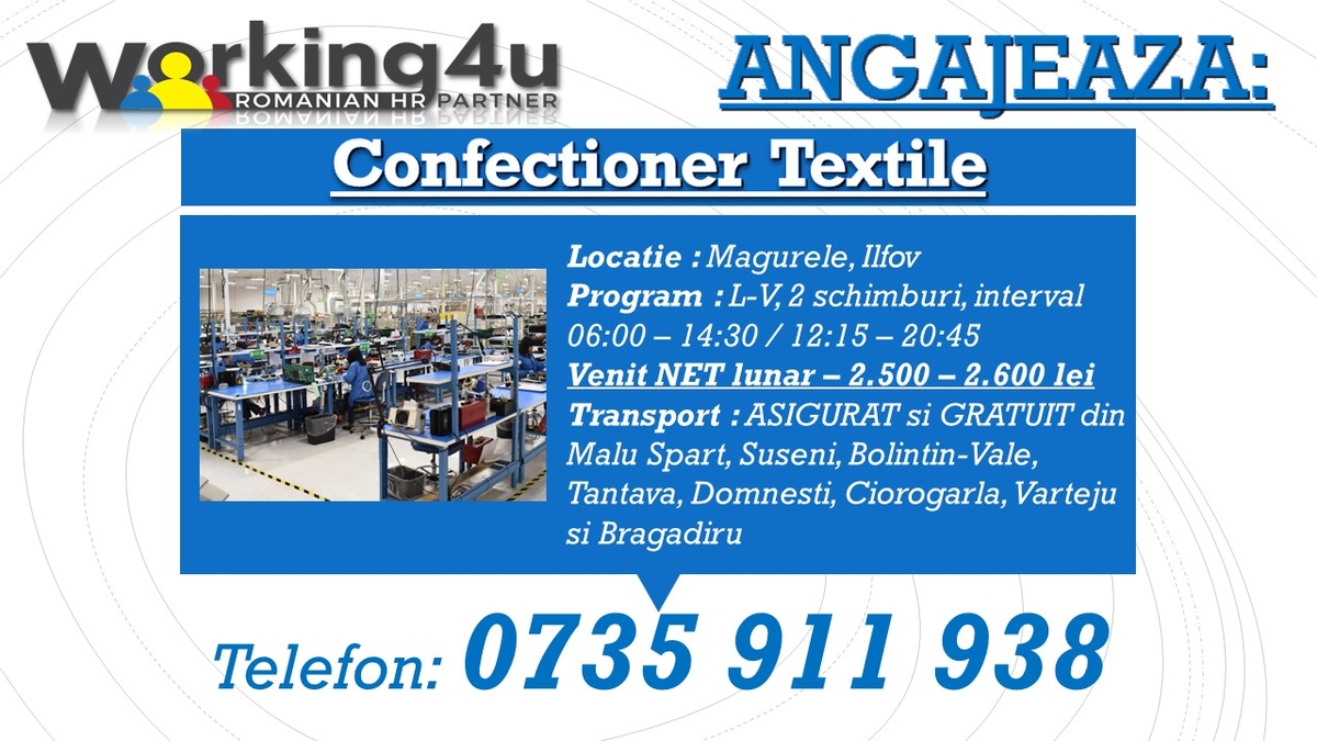 Pentru fabrica corzi elastice din Magurele, Ilfov, suntem in cautare de Confectioneri Textile cu/fara calificare si experienta. Pentru informatii puteti suna la tel.: