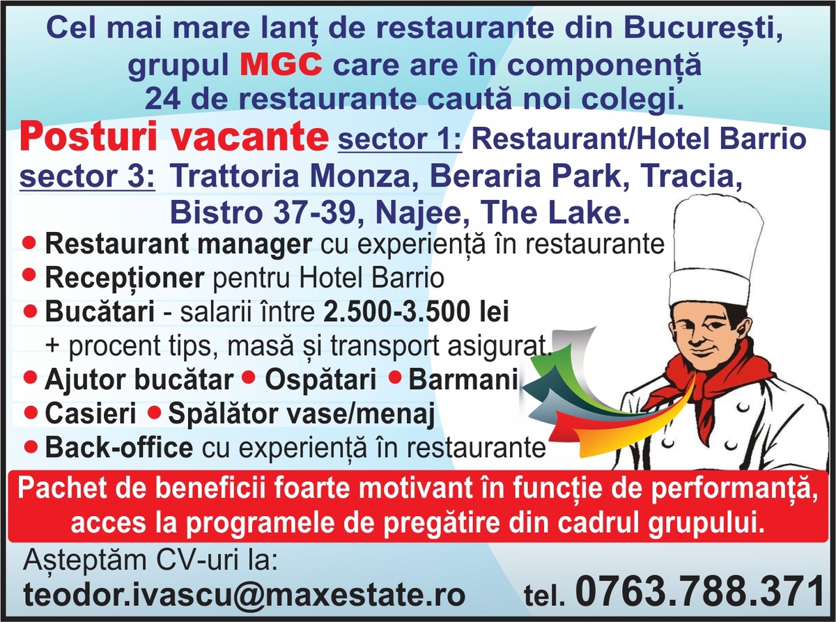 Cel mai mare lant de restaurante din Bucuresti, grupul MGC care are in componenta 24 de restaurante cauta noi colegi.
