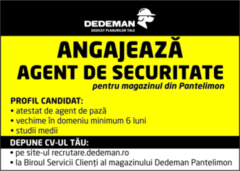 Depune CV-ul tau: pe site-ul recrutare.dedeman.ro, la Biroul Servicii Clienti al magazinului Dedeman Pantelimon.