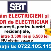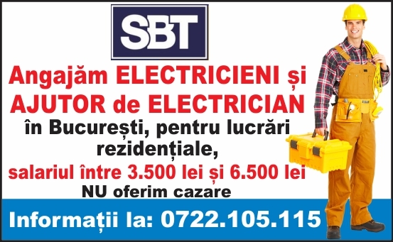 Angajam Electricieni si Ajutor de electrician, in Bucuresti, pentru lucrari rezidentiale, salariul intre 3500 lei si 6500 lei. Nu oferim cazare. Informatii la tel.