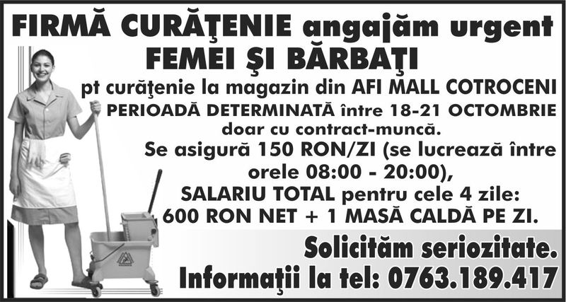 firma curatenie angajam urgent femei si barbati pt. curatenie la magazin din Afi Mall Cotroceni. Perioada determinata intre 18-21 octombrie doar cu contract munca. Se asigura 150 lei/zi (se lucreaza intre orele 08.00- 20.00) salariu total pentru cele 4 zile: 600 lei net+ 1 masa calda pe zi. Solicitam seriozitate. Info la tel.