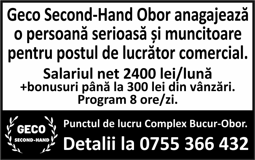 anagajeaza o persoana serioasa si muncitoare pentru postul de lucrator comerial. Salariul net 2400 lei/luna + bonusuri pana la 300 lei din vanzari. Program 8 ore/zi. Punctul de lucru Complex Bucur - Obor. Detalii la tel.