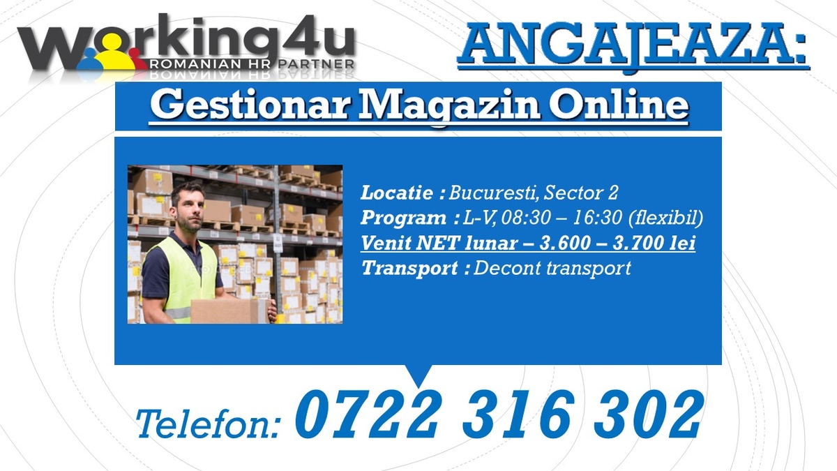 Recrutam gestionar magazin online cu cunostinte PC si experienta in logistica pentru companie de distributie piese HoReCa din Sector 2, Bucuresti. Pentru info ne puteti contacta la tel.