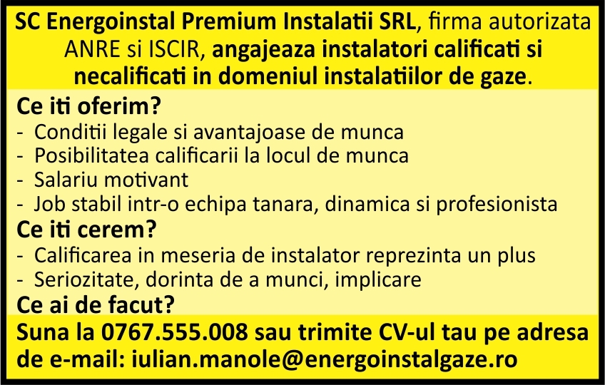 SC Energoinstal Premium Instalatii SRL, firma autorizata ANRE si ISCIR angajeaza instalatori calificati si necalificati in domeniul instalatiilor de gaze.