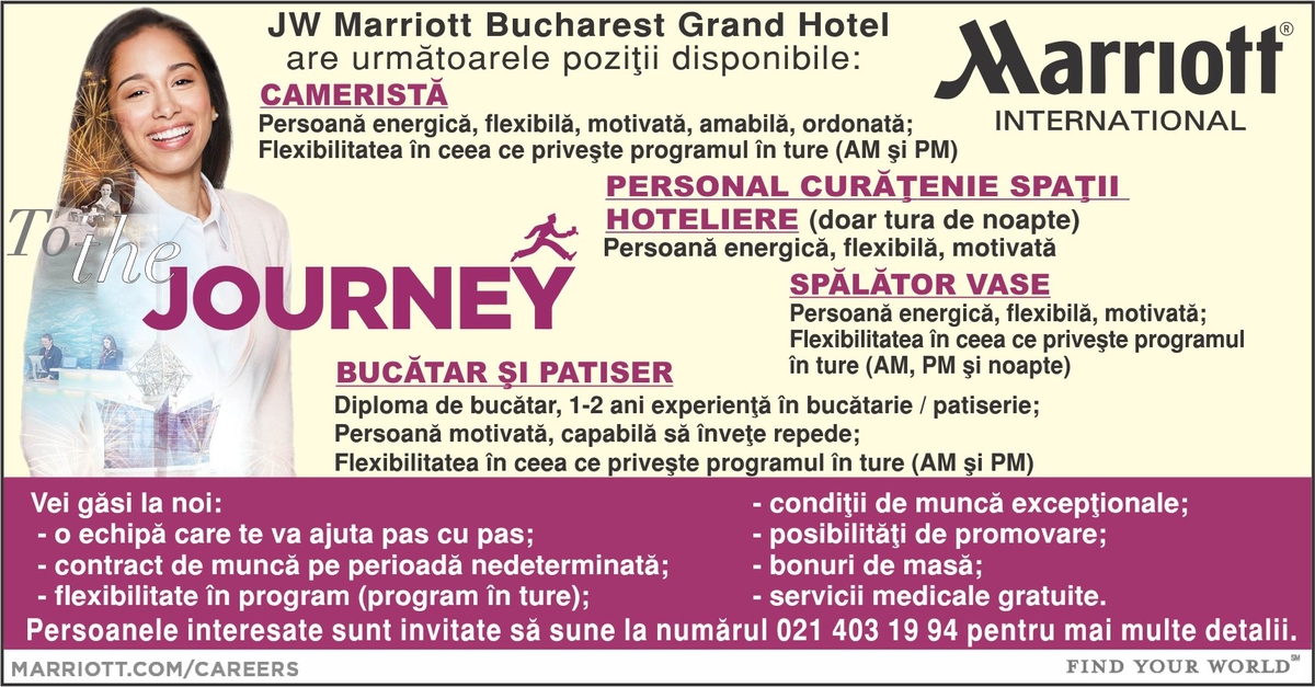 are urmatoarele posturi disponibile:Bucarar si Patiser,Diploma de bucatar, 1-2 ani experienta in bucatarie / patiserie;Persoana motivata, capabila sa invete repede;Flexibilitatea in ceea ce priveste programul in ture (AM si PM); Camerista. persoana energica, flexibila, motivata, amabila, ordonata; Flexibilitatea in ceea ce priveste programul in ture (AM si PM); Personal curatenie spatii hoteliere (doar tura de noapte). Persoana energica, flexibila, motivata. Spalator vase. Persoana energica, flexibila, motivata; Flexibilitatea in ceea ce priveste programul in ture (AM, PM si noapte).