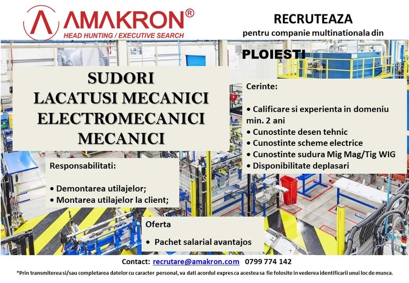 mecanici, Amakron angajeaza pentru o companie care activeaza in domeniul relocarilor industriale, din ploiesti. Pachet salarial extrem de motivant