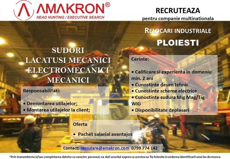 AMAKRON angajeaza pentru o companie care activeaza in domeniul Relocarilor industriale, din Ploiesti: