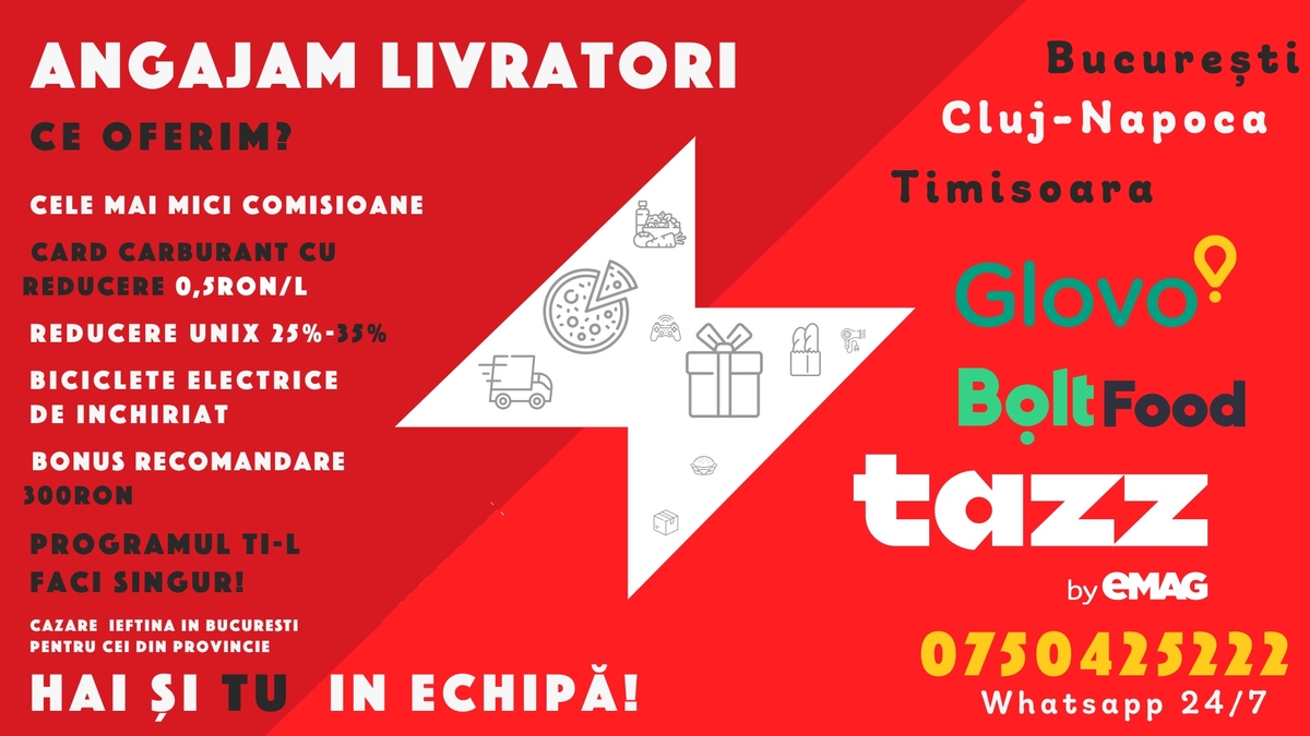 Loc de munca Livrator Masina/ Scooter/ Bicicleta Full Time (8h) Part Time (4h). Cazare pentru cei din afara orasului (Bucuresti). Partener Glovo, Bolt Food, Tazz by Emag!!!