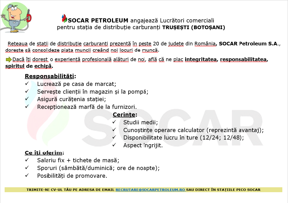 Socar Petroleum angajeaza lucrator comercial in statia de distributie carburant din Trusesti, Botosani.