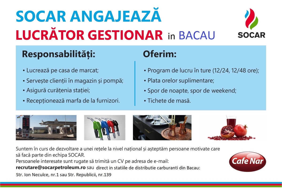 pentru statiile de distributie carburanti. Persoanele interesate ne pot trimite CV-ul pe email: recrutare@socarpetroleum.ro sau direct in statiile Peco