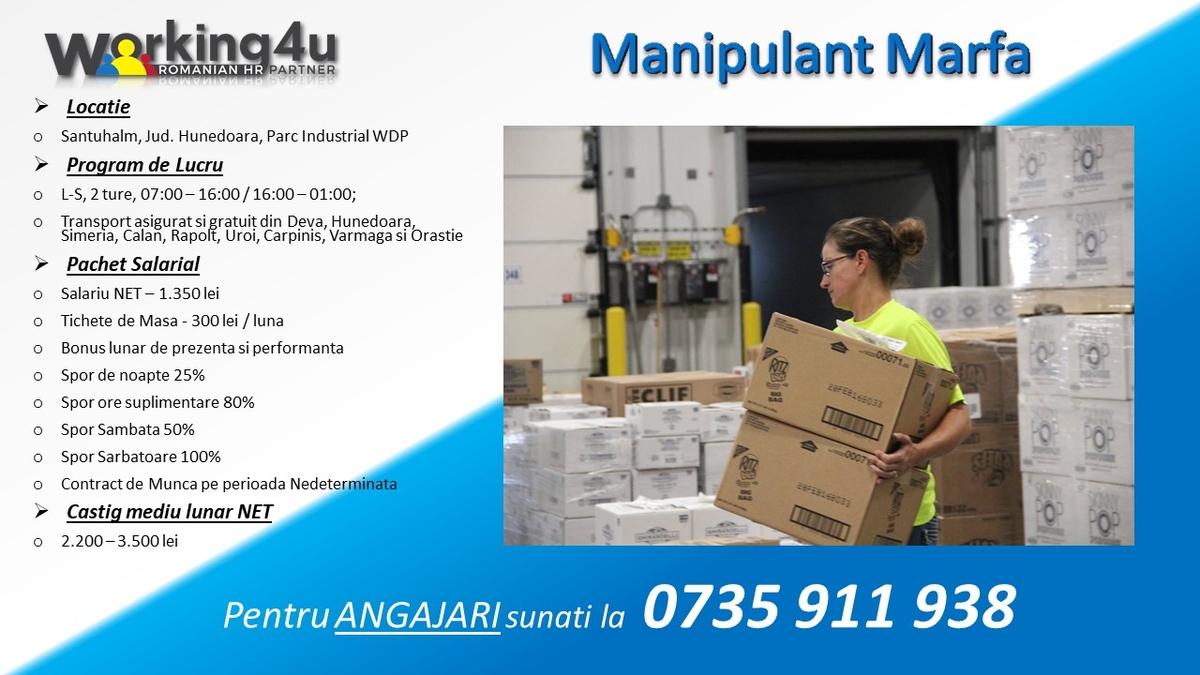 recrutam lucratori depozit pentru depozit logistic din Santuhalm, Hunedoara. Transport asigurat si gratuit, salariu motivant, bonusuri, 2 schimburi. Pentru angajari sunati la tel. 0735.911.938.