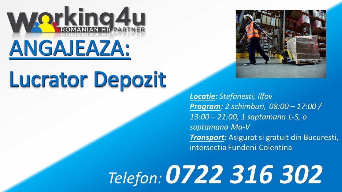 pentru companie distributie bauturi alcoolice din Stefanesti angajam noi colegi sau colege pentru postul de lucrator depozit. Transport asigurat din Sector 2. Pentru informatii sunati la 0722.316.302;