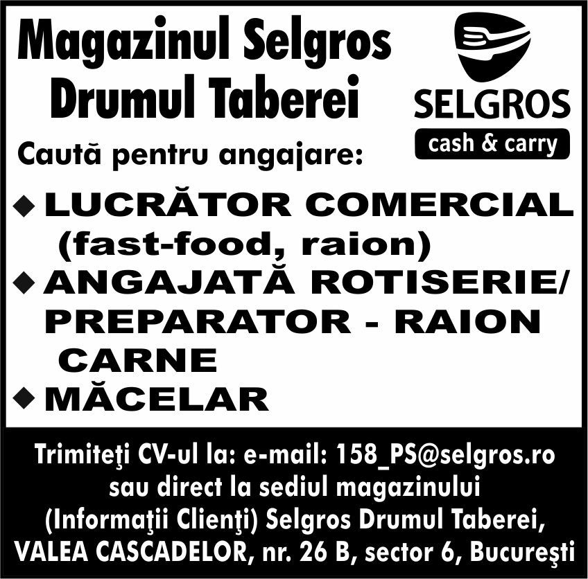Cauta pentru angajare: Lucrator comercial(fast-food, raion); Angajata rotiserie/preparator - raion carne; Macelar. Trimiteti CV-ul la: e-mail sau direct la sediul magazinului (Informatii Clienti) Selgros Drumul Taberei, Valea Cascadelor nr. 26 B, sector 6, Bucuresti.