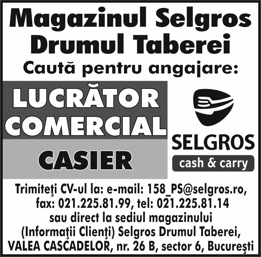 casier. Trimiteti CV- ul la e-mail: 158_ps@selgros.ro. fax: 021/2258199, tel. sau direct la sediul magazinului (Informatii clienti) Selgros Drumul Taberei, Valea Cascadelor nr.26 B, sector 6, Bucuresti;