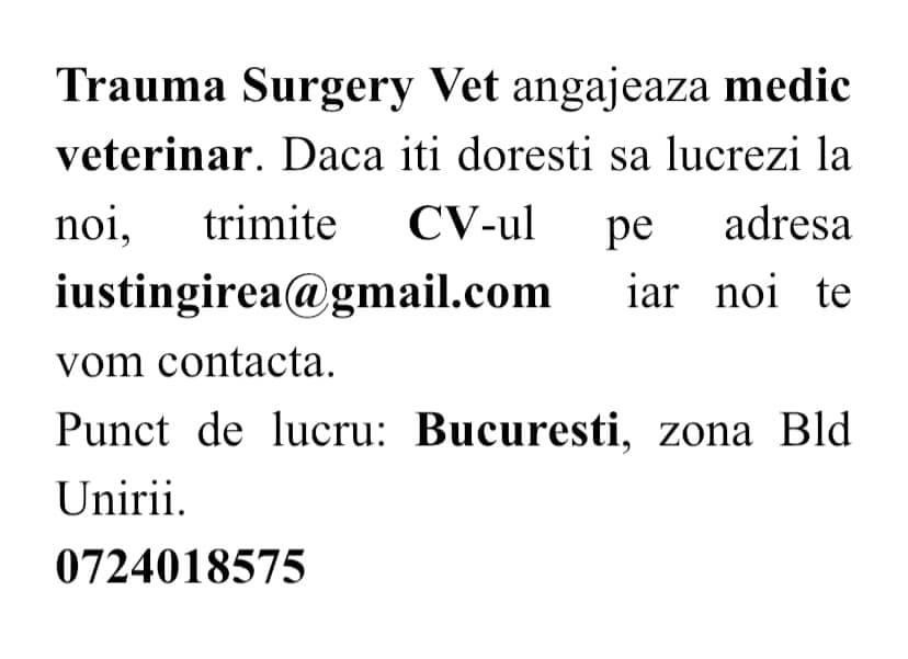 Clinica Trauma Surgery Vet din sect 3, zona Bld Unirii angajeaza medic veterinar. Experienta nu este esentiala. Epatia, seriozitatea si dorinta de a invata sunt obligatorii.
