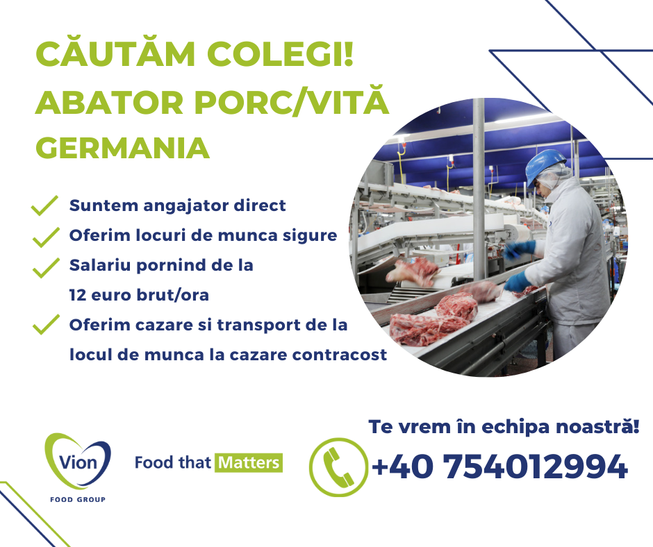 Angajam muncitori in abator de porc/vita Vion Germania. Posturi disponibile in taiere si tranasare. Suntem angajator direct, oferim cazare si transport contracost. Detalii: +40754012994.