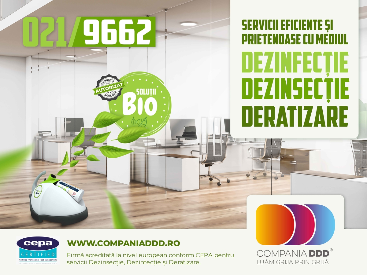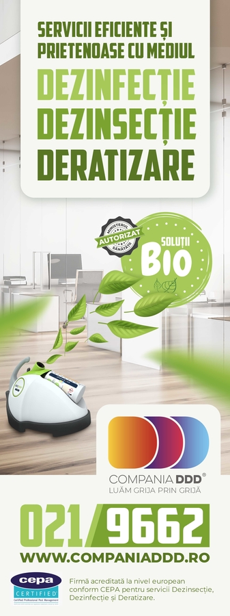Compania DDD a inceput activitatea in Romania din anul 2011 ajungand unul din principalii prestatori de servicii de preventie si combatere a daunatorilor din tara. Din anul 2014 a luat fiinta prima echipa operationala proprie din afara Bucurestiului, la Tg-Jiu. Acum Compania DDD are echipe proprii operationale prezente atat in Bucuresti, cat si in Targu Jiu, Constanta, Timisoara, Panciu, Cluj cu ajutorul carora deservim clientii la nivel national. Prima si singura firma de profil din Romania ce detine acreditare europeana pentru servicii profesionale de Dezinsectie, Dezinfectie si Deratizare, Acreditarea CEPA - CEN EN 16.636. Compania DDD este partenerul de incredere al specialistilor din multiple domenii de activitate: retail, sanitar, invatamant, institutii publice de stat, fabrici, etc. avand o experienta de 10 ani in domeniul DDD (PestControl, Dezinsectie, Dezinfectie, Deratizare). Cultivam calitatea, oferind solutii adecvate problemelor cu care se confrunta clientii, prin comunicare deschisa incurajand relatiile de colaborare. Viziunea Companiei DDD este de a deveni alegerea numarul 1 atat a agentilor economici si insitutiilor publice de stat dar si a persoanelor fizice din Romania, atunci cand doresc un partener profesionist pentru serviciile DDD. Descrierea Jobului: Prestarea serviciilor de combatere a daunatorilor (Dezinsectie, Dezinfectie, Deratizare); Mentinerea si dezvoltarea relatiei cu clientii in zona arondata (Constanta); Acorda asistenta tehnica clientilor si potentialilor clienti; Negociaza si raspunde pentru corecta executare a serviciilor pentru clientii din portofoliu; Redacteaza si implementeaza IPM (Integrated Pest Management) Planuri de combatere a daunatorilor conform standard ISAcreditatrea Europeana); Completeaza documentele specifice presatarii serviciilor DDD; Incaseaza cash anumiti clienti persoane fizice; Promoveaza imaginea Companiei DDD. Cerintele postului: Domiciuliul stabil in Jud Constanta; Permis de conducere categoria B. Minim un an de experienta in condus auto categoria B; Abilitati de asimilarea rapida de informatii; Atitudine pozitiva orientata catre client si rezultat; Initiativa, ambitie si spirit de competitie; Orientat spre noi oportunitati si dezvoltare a relatiei cu clientul; Abilitati de comunicare personala si interpersonala; Putere de convingere, atentie la detalii; Disponibilitate la deplasari. Beneficii: Training de specialitate si cursuri permanente de dezvoltare profesionala; Calificare la locul de munca dupa 3 luni de colaborare; Reduceri si beneficii in cadrul companiei; Ajutor de nunta, botez, inmormantare; Suport in probleme de sanatate; Mediu de lucru placut si conditii bune de munca; Pachet salarial format din venituri fixe si variabile, personalizate pentru fiecare candidat in parte; Auto Dacia Dokker, sau Dacia MCV noi si/sau aproape noi; Salariul integral pe cartea de munca; Bonuri de masa pe card BT; Telefon mobil;