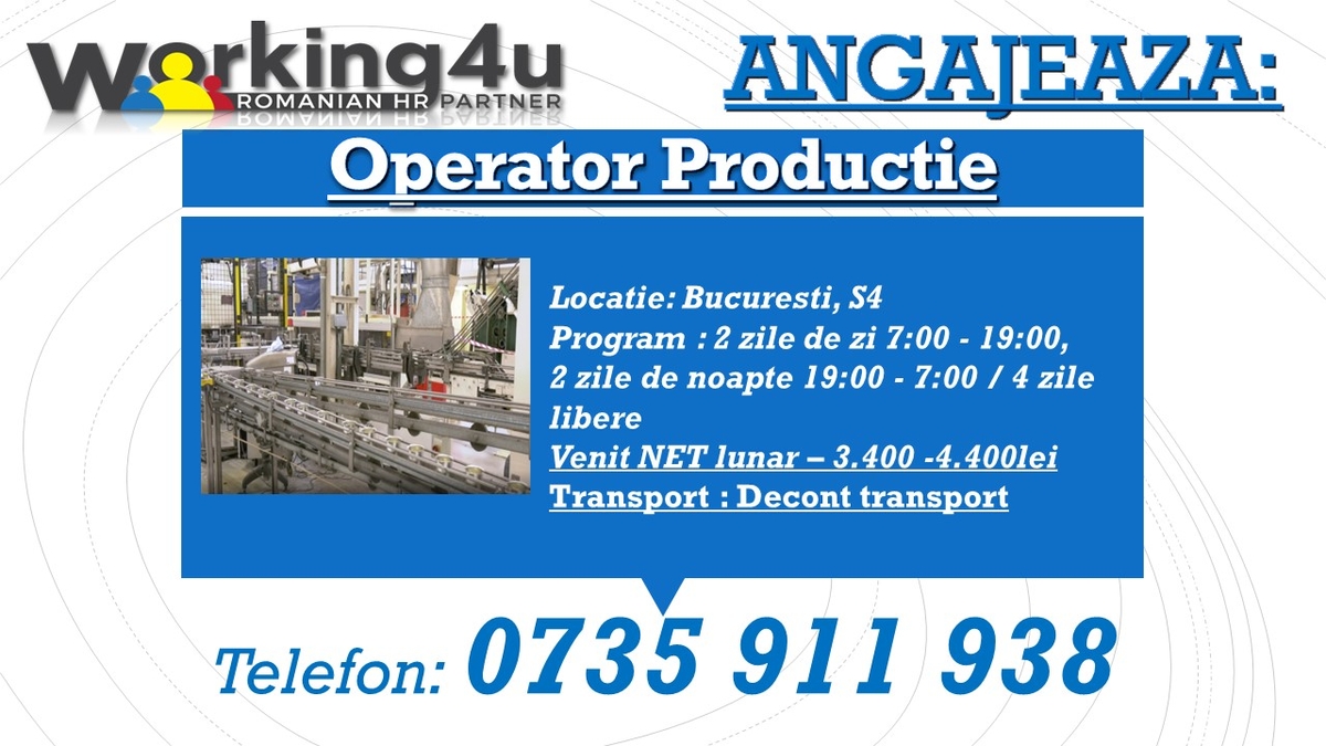 Pentru angajari, trimiteti CV-ul Dvs. pe adresa de e-mail r e c r u t a r e @ w o r k i n g 4 u . r o sau contactati-ne la numarul de telefon 0735 911 938.