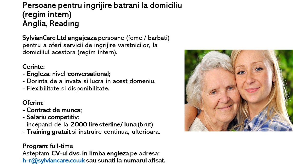 SylvianCare Ltd angajeaza persoane (femei/ barbati) pentru a oferi servicii de ingrijire varstnicilor, la domiciliul acestora (regim intern).