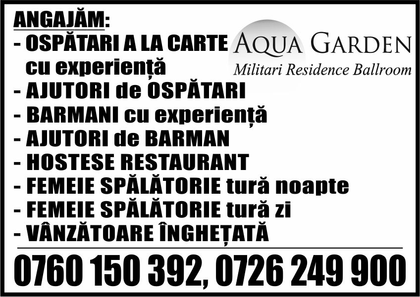Ospatari A la carte cu experienta, ajutori de ospatari, barmani cu experienta, ajutori de barman, hostese restaurant, femeie spalatorie tura noapte si tura de zi, vanzatoare inghetata.