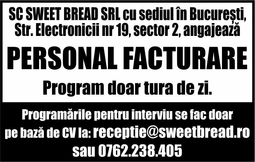 SWEET BREAD SRL cu sediul in str Electronicii 19 sector 2 Bucuresti angajeaza personal facturare. Program doar tura de zi. Programarile pentru interviu se fac doar pe baza de CV la tel sau email.