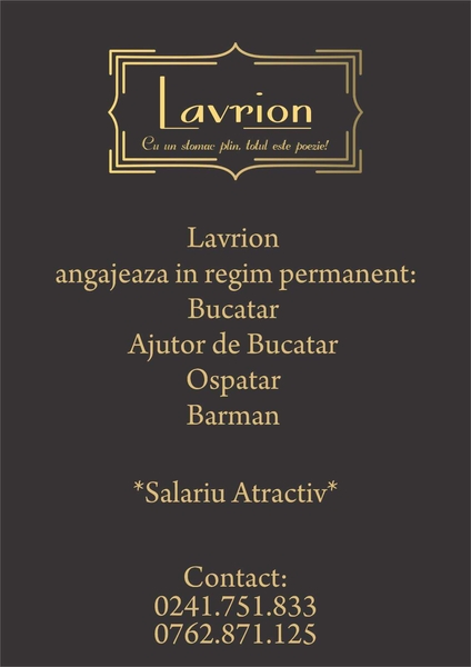 restaurant Lavrion din Mangalia si restaurant Ardeleanca din Costinesti fac angajari pentru sezonul estival dar si posturi permanente tot timpul anului.