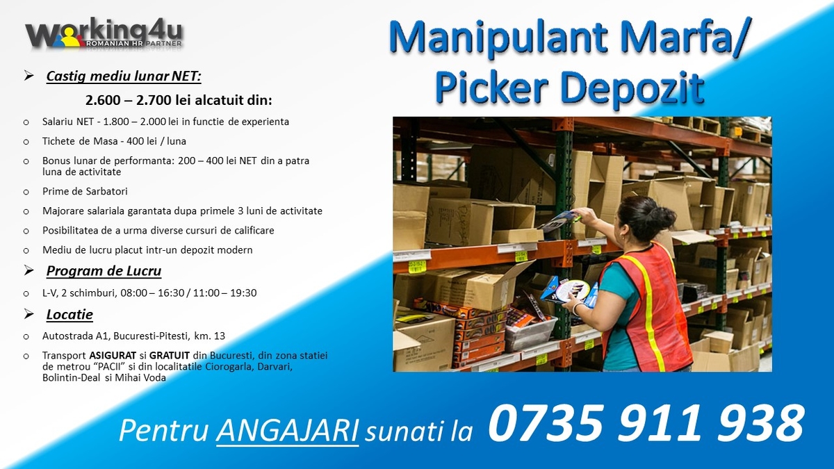 Pentru clientul nostru, unul dintre cei mai mari distribuitori de topuri de hartie din Romania, cu depozitul situat pe autostrada A1, Bucuresti-Pitesti, la km. 13, cautam un nou coleg pentru postul de Picker Depozit.
