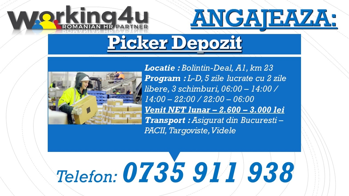Angajam pickeri pentru depozit temperatura controlata din Bolintin-Deal (A1, km 23). Cerinte: min. 10 clase, experienta in depozit. Pentru angajari sunati la tel.