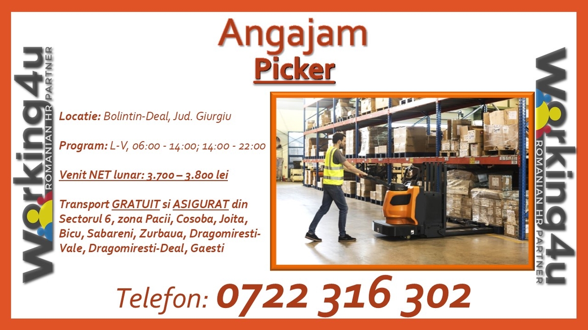 Pentru clientul nostru, lider mondial in domeniul logisticii si transporturilor de marfuri, suntem in cautare de noi colegi pentru pozitia de Picker in cadrul echipei din Bolintin-Deal, jud. Giurgiu.