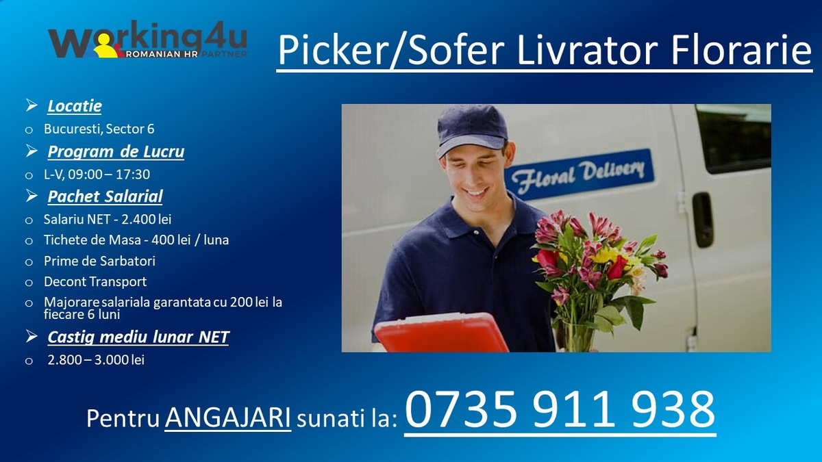 Pentru florarie online cu depozitul in Bucuresti, sector 6, cautam un nou coleg pentru pozitia de picker/ sofer livrator. Pentru angajari ne puteti contacta la numarul de tel.