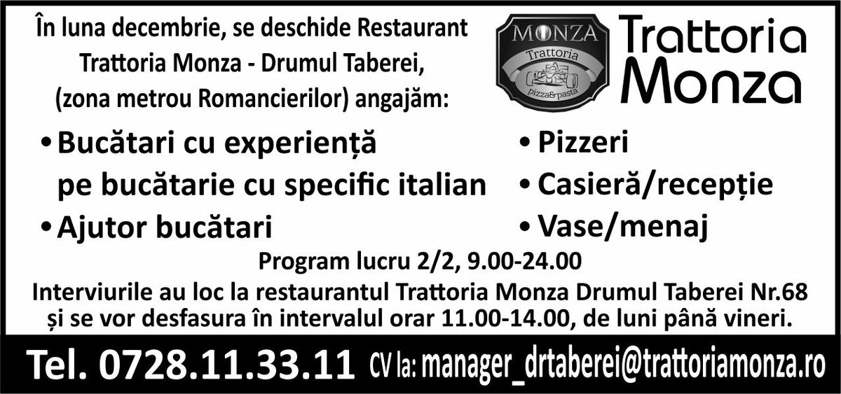 CV la : manager_drtaberei@trattoriamonza.ro
