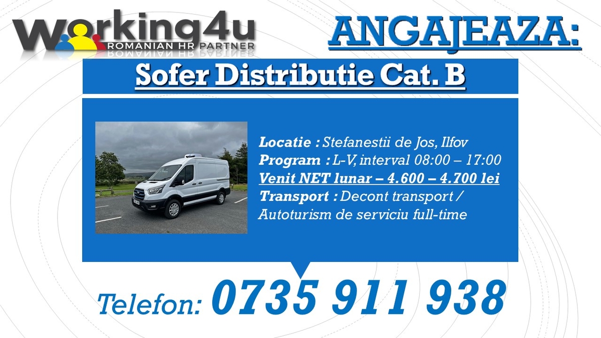 Recrutam sofer distributie Cat. B cu experienta pentru companie distributie alimente din Stefanestii de Jos. Livrari Bucuresti-Ilfov, program L-V, masina/decont transport;
