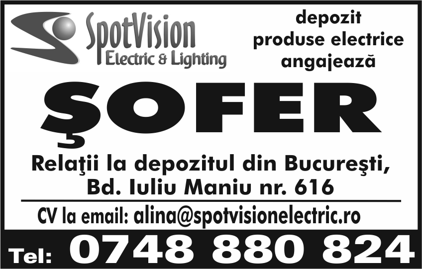 depozit produse electrice angajeaza sofer. Relatii la depozitul din Bucuresti, bd. Iuliu Maniu nr. 616, CV la email/ info la tel: