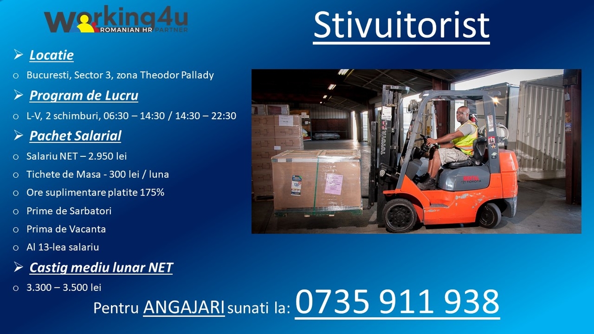 Pentru fabrica ambalaje din sticla din Bucuresti, sector 3, recrutam noi colegi pe postul de Stivuitorist cu minim 1 an experienta. Pentru angajari sunati la tel.