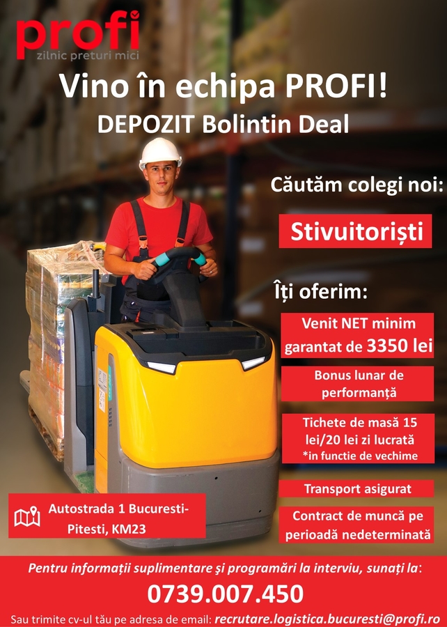 Angajam STIVUITORISTI pentru depozitul PROFI din Bolintin Deal.