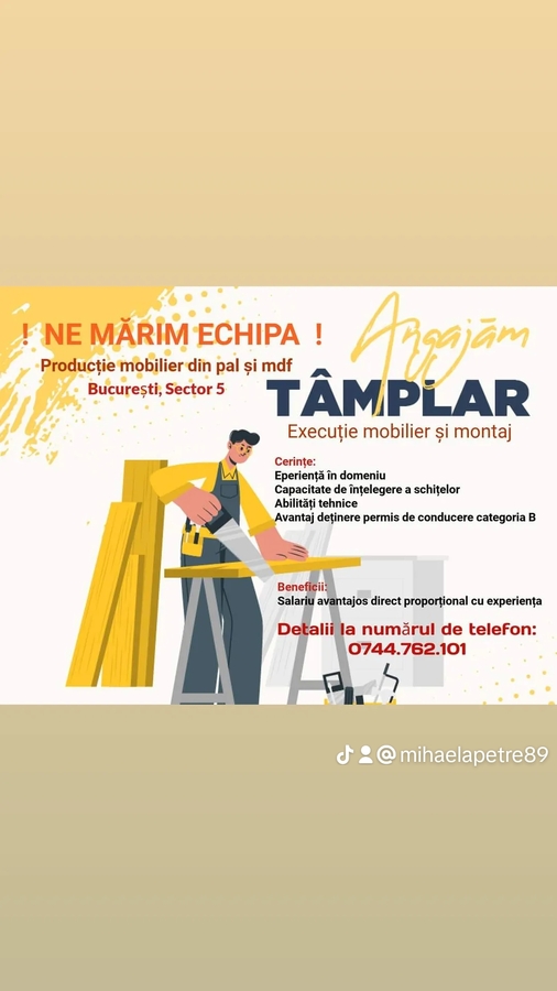 Angajez tamplar cu experienta pentru atelier de productie mobilier la comanda. Pentru detalii, va rog sa ma contactati telefonic. Locatia atelierului: Sector 5, Bucuresti. Valabil doar pentru cei cu experienta,