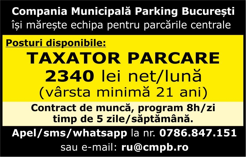 Compania Municipala Parking Bucuresti isi mareste echipa pentru parcarile centrale. Posturi disponibile: Taxator parcare, 2340 lei net/luna. Contract de munca, program 8 h/zi timp de 5 zile/saptamana. Apel/sms/whatsapp la tel sau e-mail: