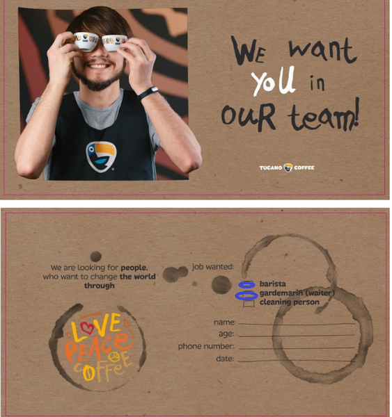 «Tucano Coffee» este o Companie pentru care oamenii sunt foarte importanţi. Ştim că putem ajunge unde dorim numai cu ajutorul şi sprijinul oamenilor pe care îi angajăm, tocmai de aceea suntem foarte diferiti.