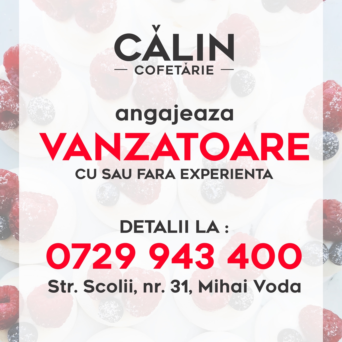 Cofetaria Calin, situata in Mihai Voda, str. Scolii, nr.31 angajeaza persoana pentru vanzare. Experienta in domeniu nu este necesara. Mediu de lucru placut si linistit.