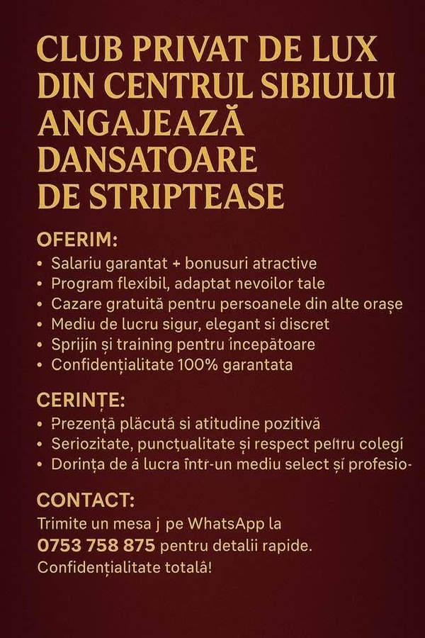 Vino in echipa tanara de la clubul de noapte Blue Moon Sibiu ( CENTRUL ISTORIC ) si descopera ca viata poate fi mai usoara decat cred majoritatea! Ca dansatoare intr-un club de noapte banii vin la tine dansand! Mai simplu de atat nu se poate !!! Ca sa aplici pentru o slujba bine platita, pe salariu mare, contacteaza-ne prin email la angajari@night-club-sibiu.ro sau prin telefon la 0753.758.875