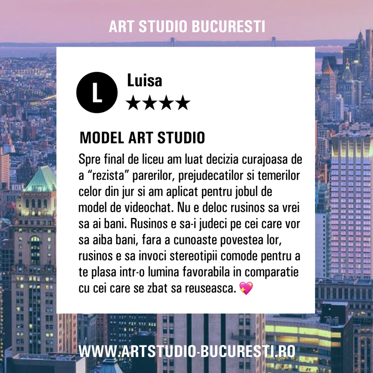 "Cred ca orice meserie are nevoie sa fie privita cu mintea deschisa si fara prejudecati. Spre final de liceu am luat decizia curajoasa de a “rezista” parerilor, prejudecatilor si temerilor celor din jur si am aplicat pentru jobul de model de videochat. Nu e deloc rusinos sa vrei sa ai bani. Rusinos e sa-i judeci pe cei care vor sa aiba bani, fara a cunoaste povestea lor, rusinos e sa invoci stereotipii comode pentru a te plasa intr-o lumina favorabila in comparatie cu cei care se zbat sa reuseasca." (Luisa A. )