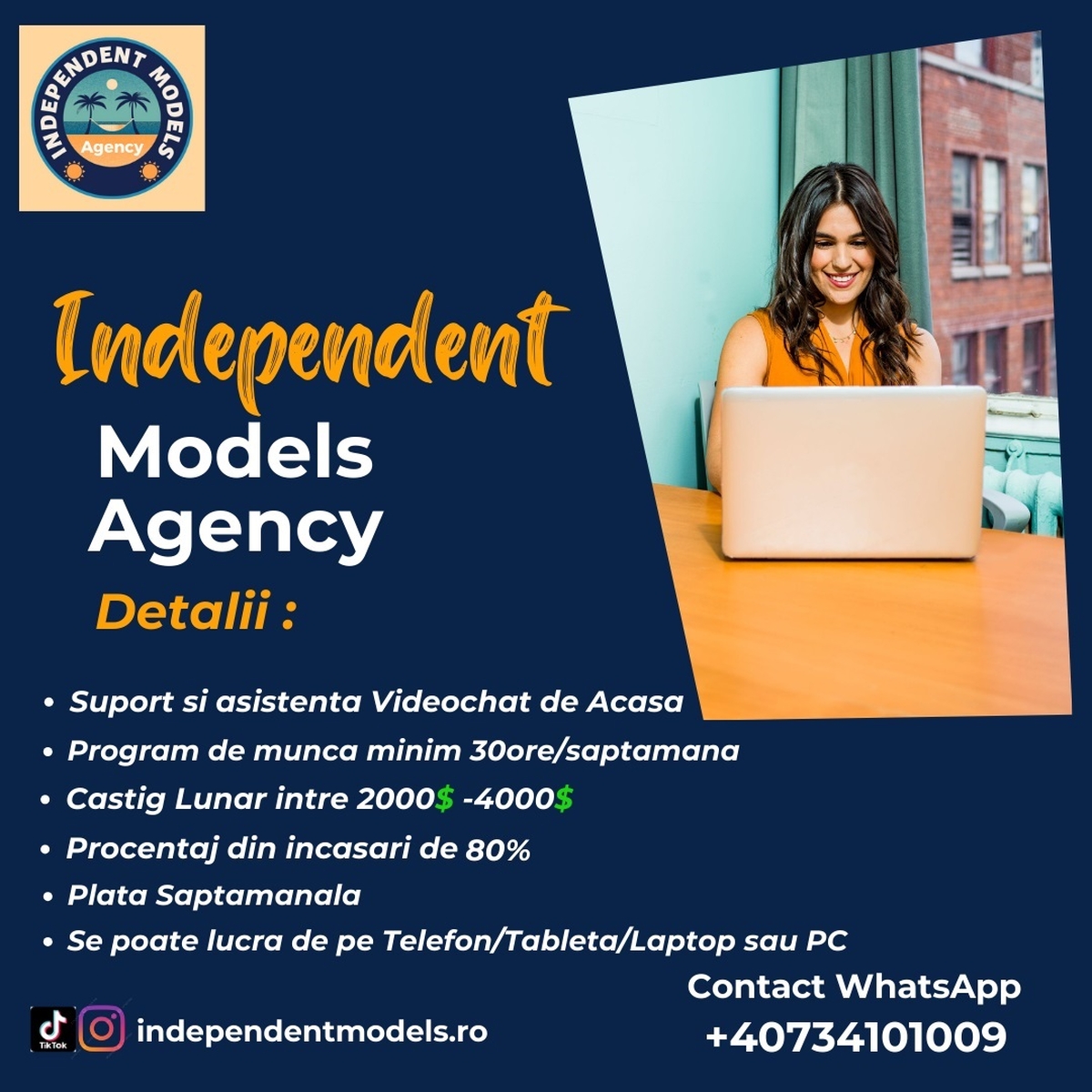 Colaboram doar cu persoane peste 18 ani, femei, barbati, cupluri. Oferim procentaje de 80% din incasari. Plata saptamnala. Se poate lucra de pe Laptop/PC sau telefon/tableta. Contact Whatsapp;
