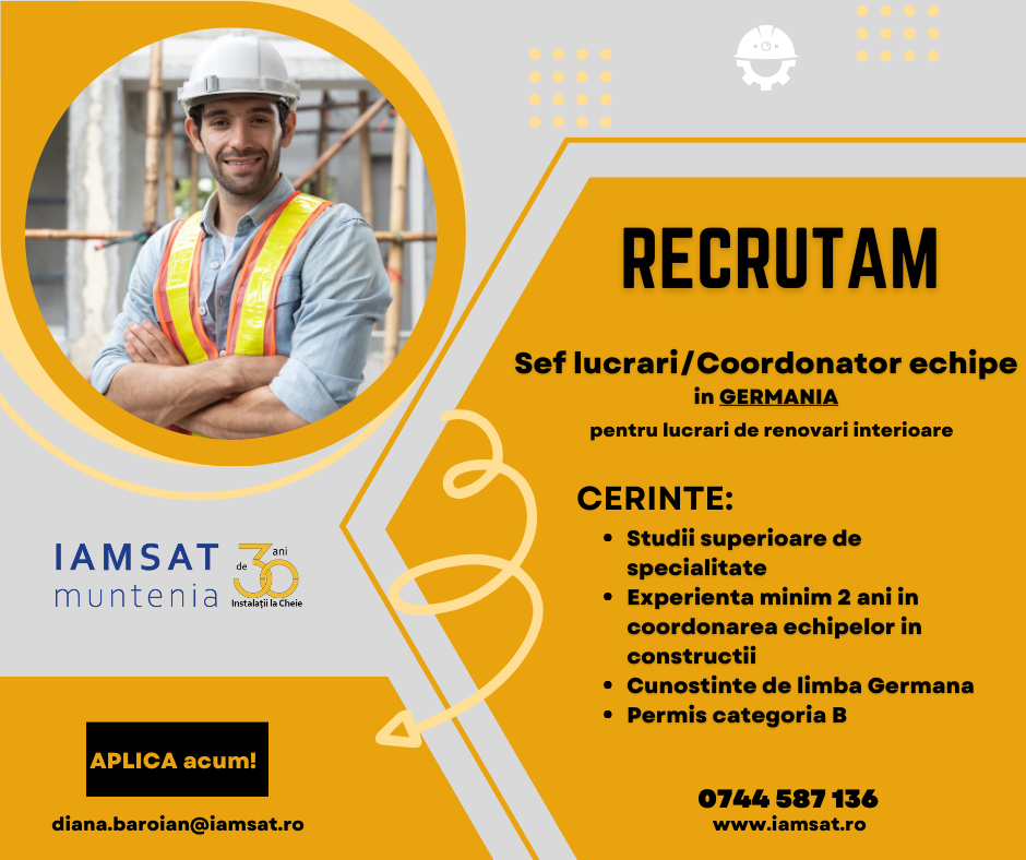 Vrei sa ai succes in strainatate? Vino in echipa si ocupa postul de sef lucrari in Germania. De preferat, sa ai ceva experienta in constructii, renovari interioare.