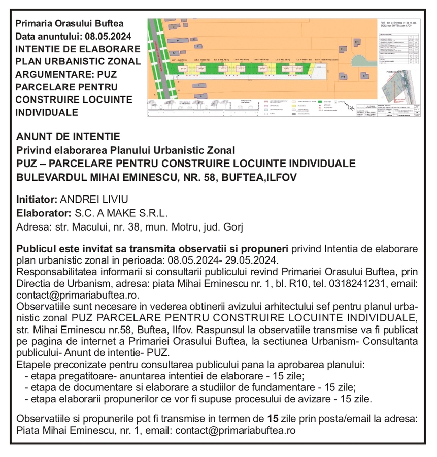 str. Mihai Eminescu nr.58, Buftea, Ilfov. Raspunsul la observatiile transmise va fi publicat